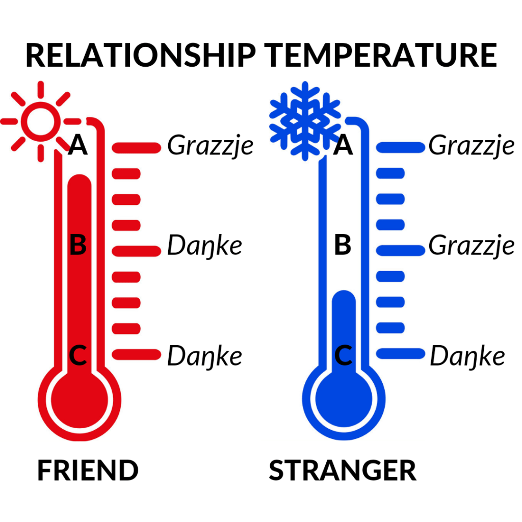 The relationship temperature is known to both of you through eight temperature words that are used as an index of it. In English they are known as “magic words” and are “thank you”, “sorry/excuse me”, “please” and “don’t mention it/here it is”.
