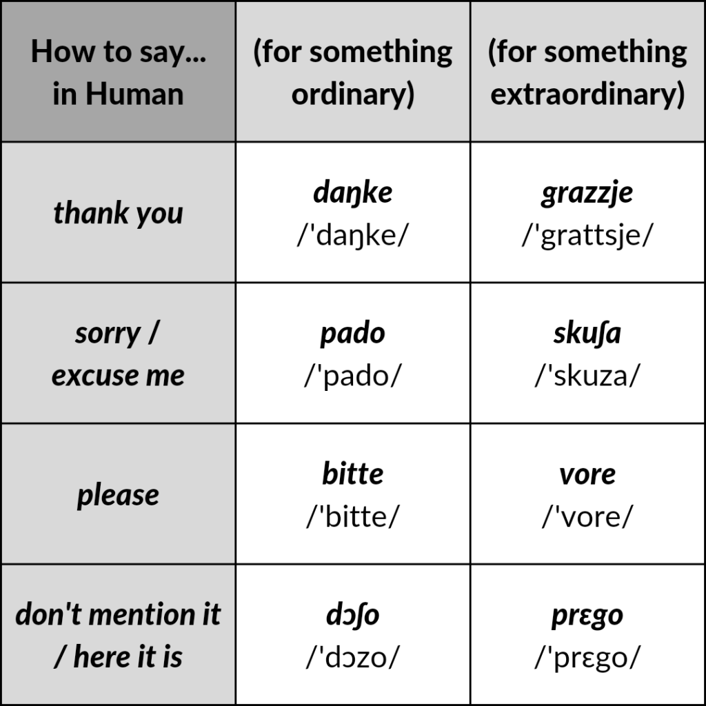 Here is a Human saying, that now you could understand: «Friendships are born with a grazzje and die with a prɛgo».